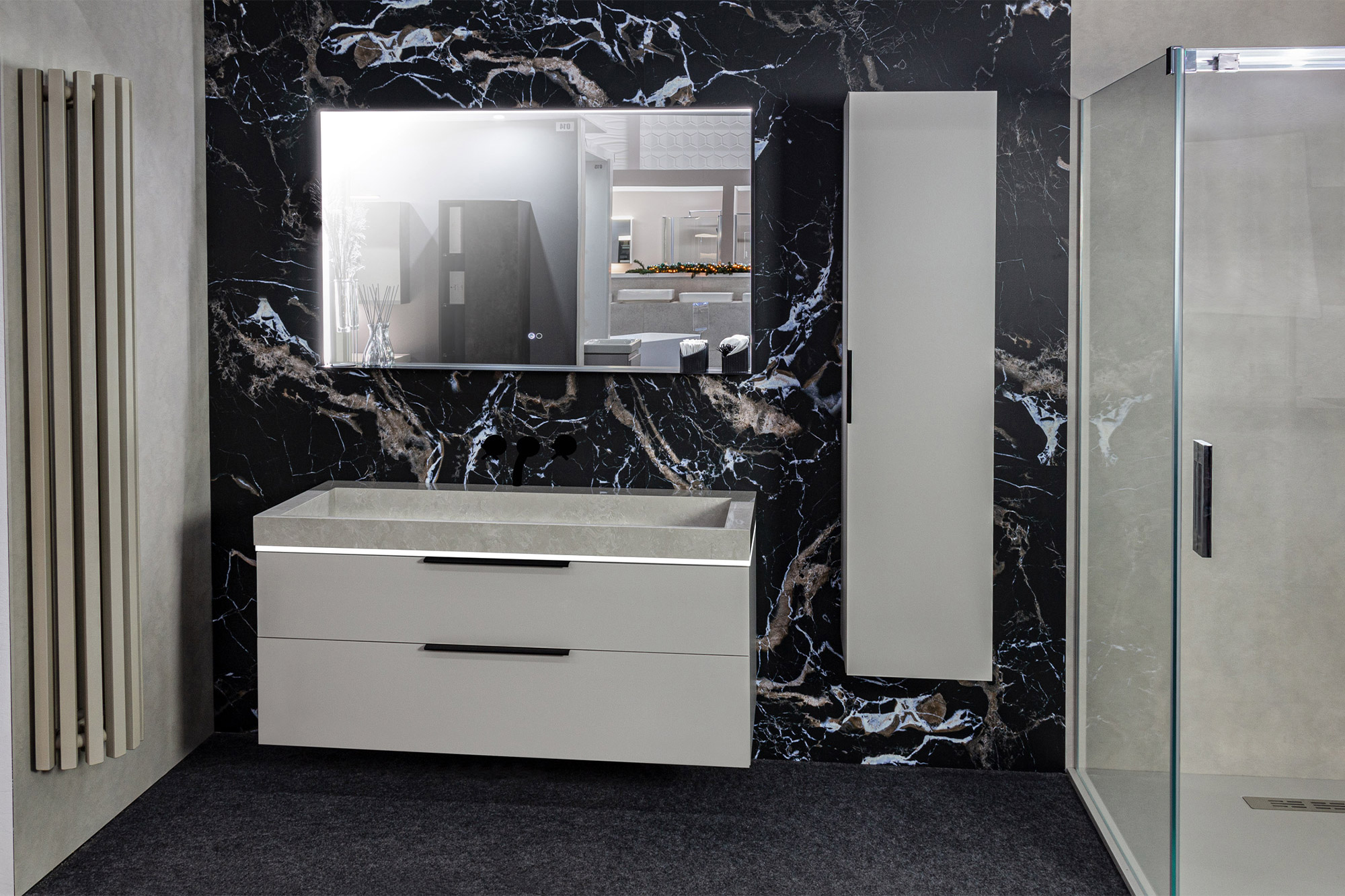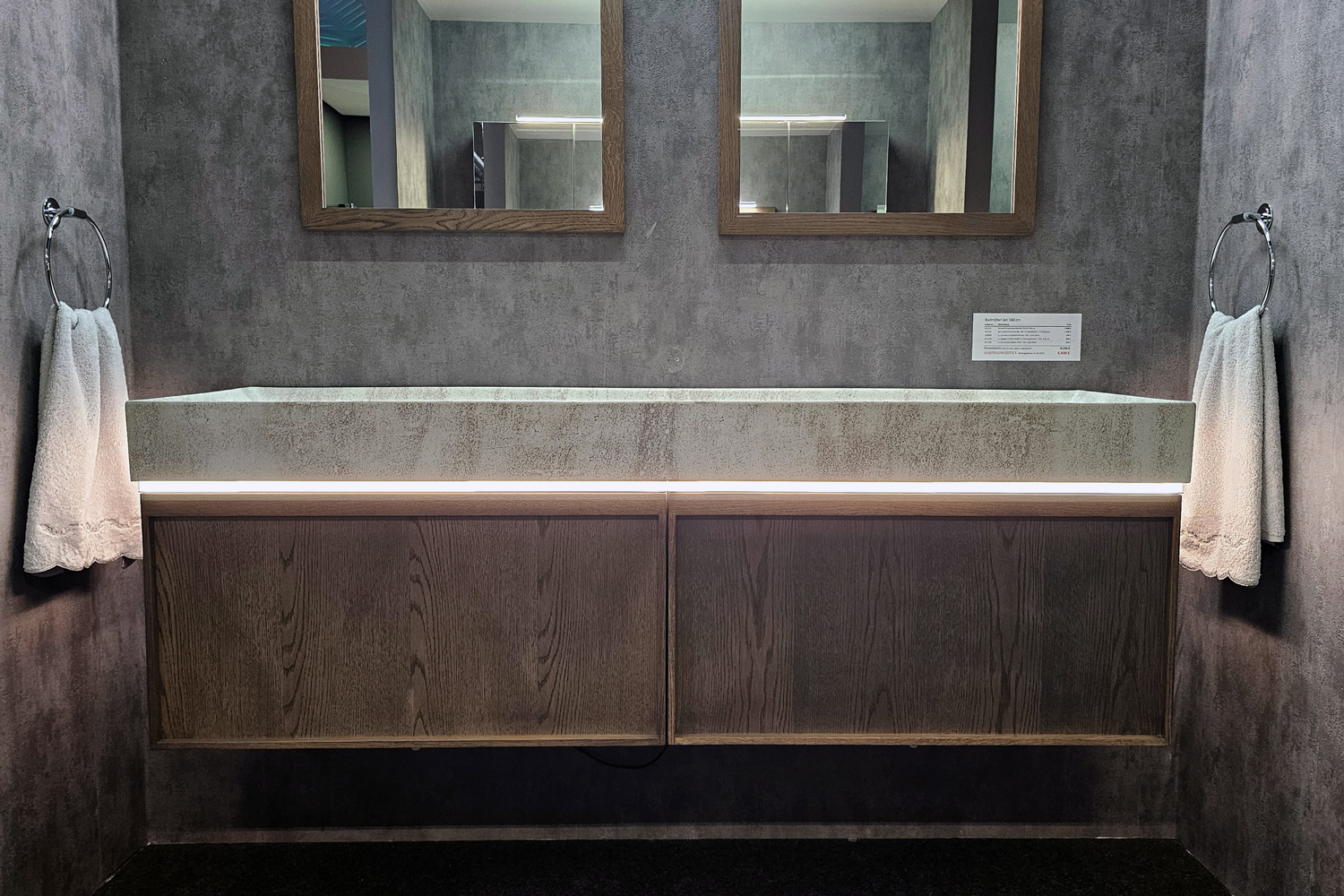 Badmöbel Doppelwaschtisch 160 cm Echtholz Eiche geräuchert Badmöbel Doppelwaschtisch 160 cm Echtholz Eiche geräuchert NP 8.200,- € / jetzt nur 6.800 € AUSSTELLUNGSSTÜCK – sofort zum Mitnehmen BADMÖBEL WASCHTISCH-SET 160 cm besteht aus: Waschtischunterschrank 160 cm 4 x GRASS Schubladen mit Selbsteinzug (2 + 2 innenschubladen) Farbe: geräucherte…