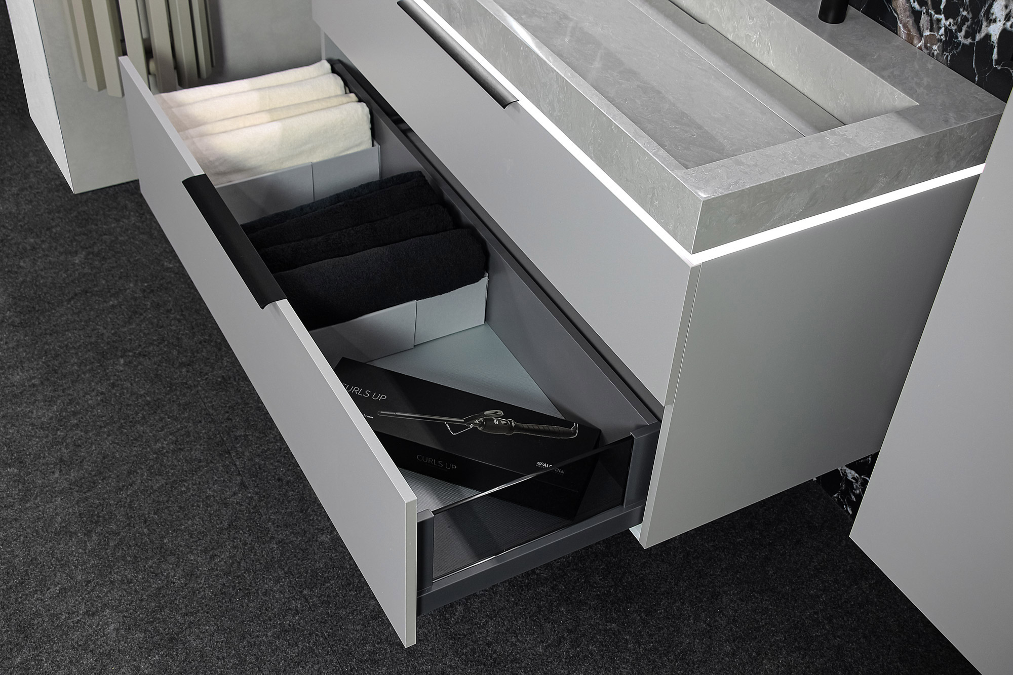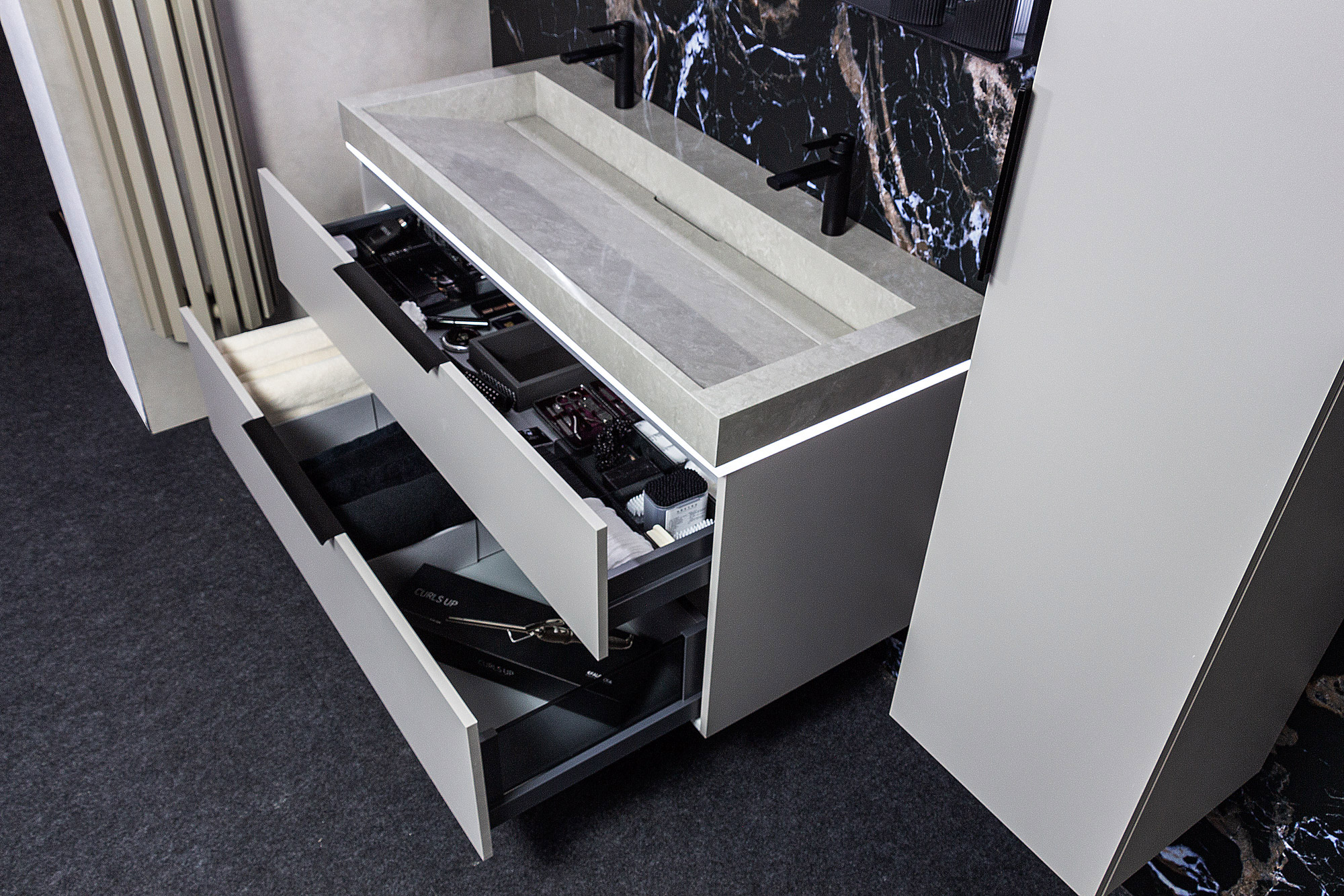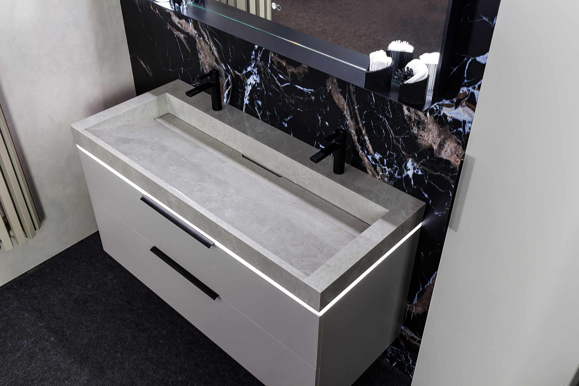 Badezimmermöbel AUSSTELLUNGSSTÜCK – sofort zum Mitnehmen Badmöbel 120 cm – Set besteht aus: Waschbecken 120 x 50 x 8 cm