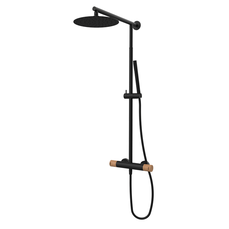 COOL Thermostatische Duscharmatur mit Teleskopsäule Handbrause und rundem Duschkopf schwarz Ahorn